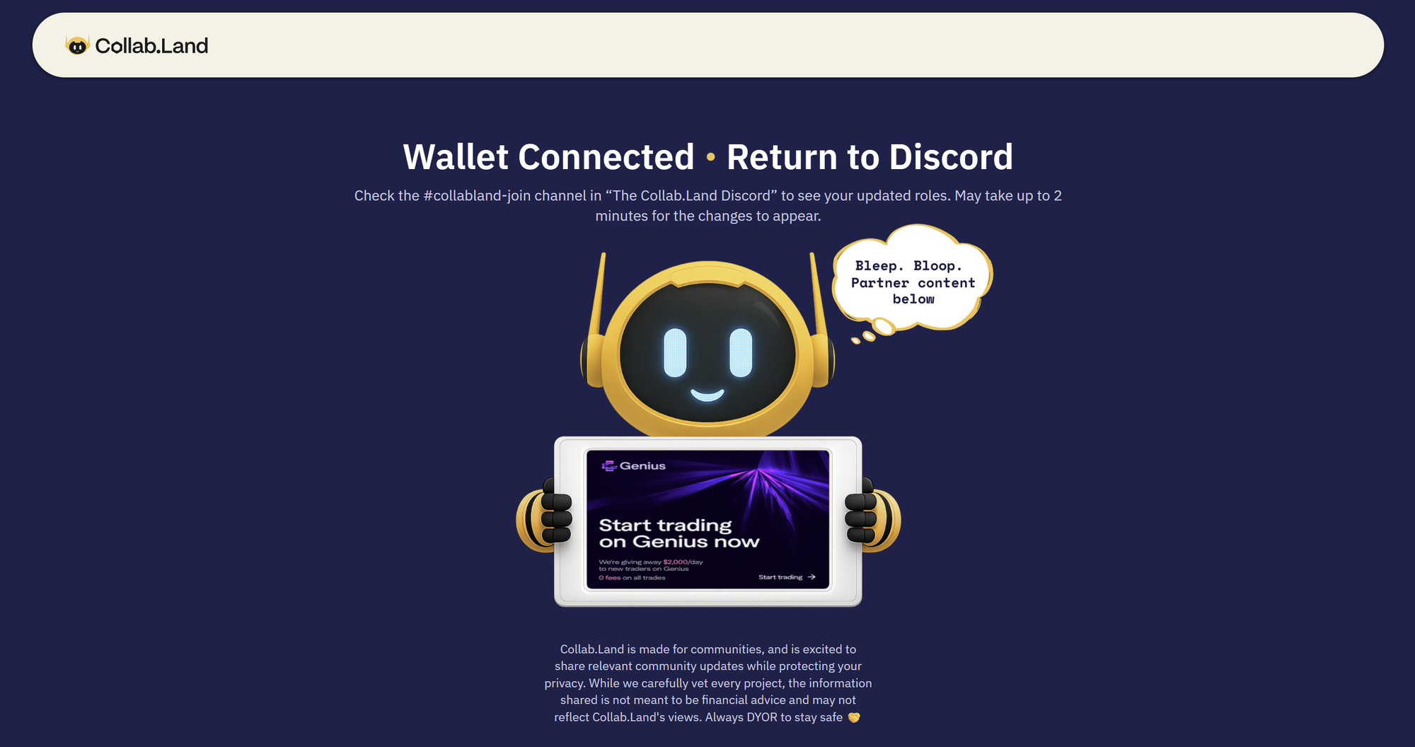 ps. This works for Telegram too. The same Delegate verification flow applies in Telegram communities powered by Collab.Land. Instead of a Discord verification channel, look for the collablandbot. Tap the verification link it provides, and you will be directed to the same connect.collab.land verification site. From there, follow the same steps: select Delegate, connect your hot wallet delegate, sign the verification message, and select your main/vault wallet. Your access will be granted based on the assets in your vault. No exposure required.